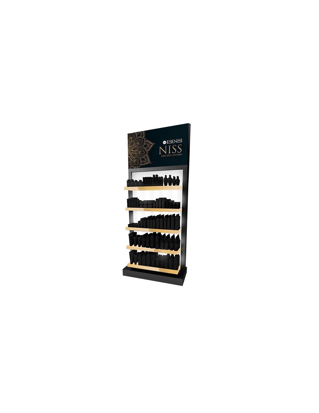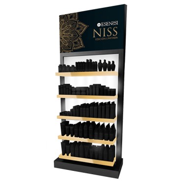 Un elegante mueble en madera lacada negra con llamativos contrastes dorados o plateados. Un toque especialmente lujoso para esta sección de perfumería de ediciones limitadas. Va totalmente iluminado en la parte superior y trasera, por lo que los productos dispuestos en sus 5 secciones resaltan de forma considerable llamando la atención del cliente hacia ellos. Podrás elegir el tuyo con 4 estanterías y un cajón inferior o 5 estanterías distribuidoras.